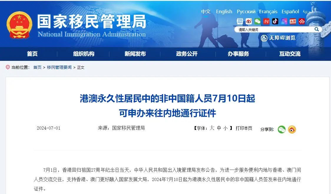 今日,国家出入境管理局发布公告,为进一步服务便利内地与香港、澳门间人员交流交往,支持香港、澳门更好融入国家发展大局,2024年7月10日起为港澳永久性居民中的非中国籍人员签发来往内地通行证件。