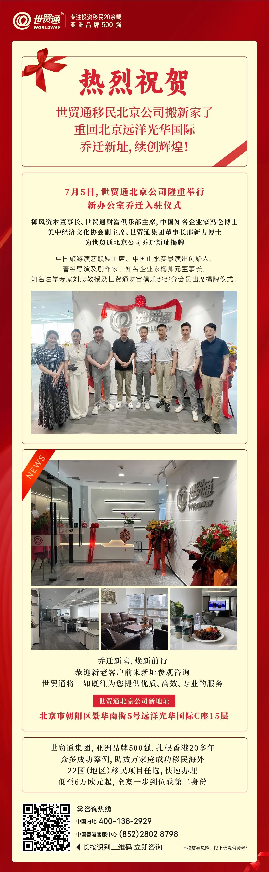 盛夏乔迁新门第,祥云浩气报佳音!2024年7月5日上午,世贸通移民北京公司隆重举行新办公室乔迁入驻仪式,乔迁新喜,现场喜气洋洋!御风资本董事长、世贸通财富俱乐部主席,中国知名企业家冯仑博士与美中经济文化协会副主席、世贸通集团董事长邢新力博士,为世贸通北京公司乔…