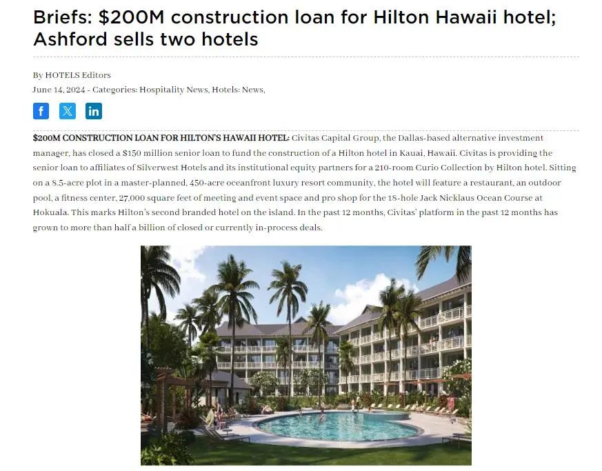 近日,由资本巨头联手打造的「夏威夷格芮度假酒店」EB-5乡村项目迎来重大好消息。据美国HOTELS杂志报道,位于达拉斯的另类投资管理公司Civitas Capital Group已为该项目完成了一笔1.5亿美元的高级贷款,用于建设项目将开发的拥有210间客房的希尔顿格芮精选酒店。