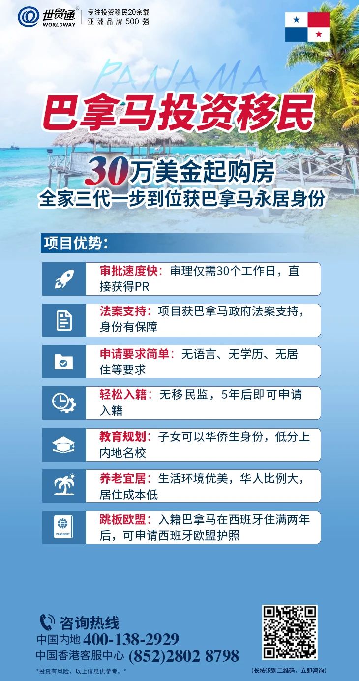 世贸通集团,亚洲品牌500强、专注投资移民20余载,作为美国投资移民、欧洲投资移民、英联邦国家投资入籍项目的积极推动者,有效促进美国投资移民、欧洲投资移民及英联邦国家投资入籍项目向有益于投资者的方向发展。20多年来,世贸通用专业的服务帮助数万个家庭,通过投资的方式成功移民海外,是您办理巴拿马移民的上佳之选!