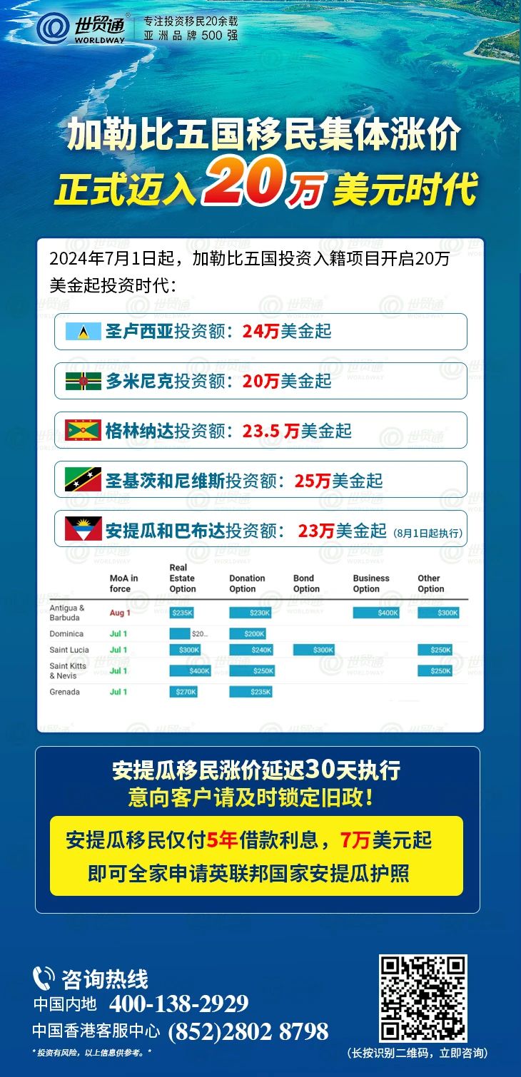 但东加勒比国家组织,只有五个国家提供投资入籍计划,允许外国人通过投资或者捐赠一步到位获得护照。这五个国家分别是:安提瓜和巴布达、圣卢西亚、多米尼克、圣基茨和尼维斯、格林纳达。此前,这五个国家的护照项目以其低价高质的超高性价比受到全球投资者的欢迎。然而,2024年7月1日起,加勒比五国投资入籍项目集体涨价,开启了20万美金起投资时代。值得庆幸的是,安提瓜移民涨价延期1个月,即8月1日起涨至23万美金起。