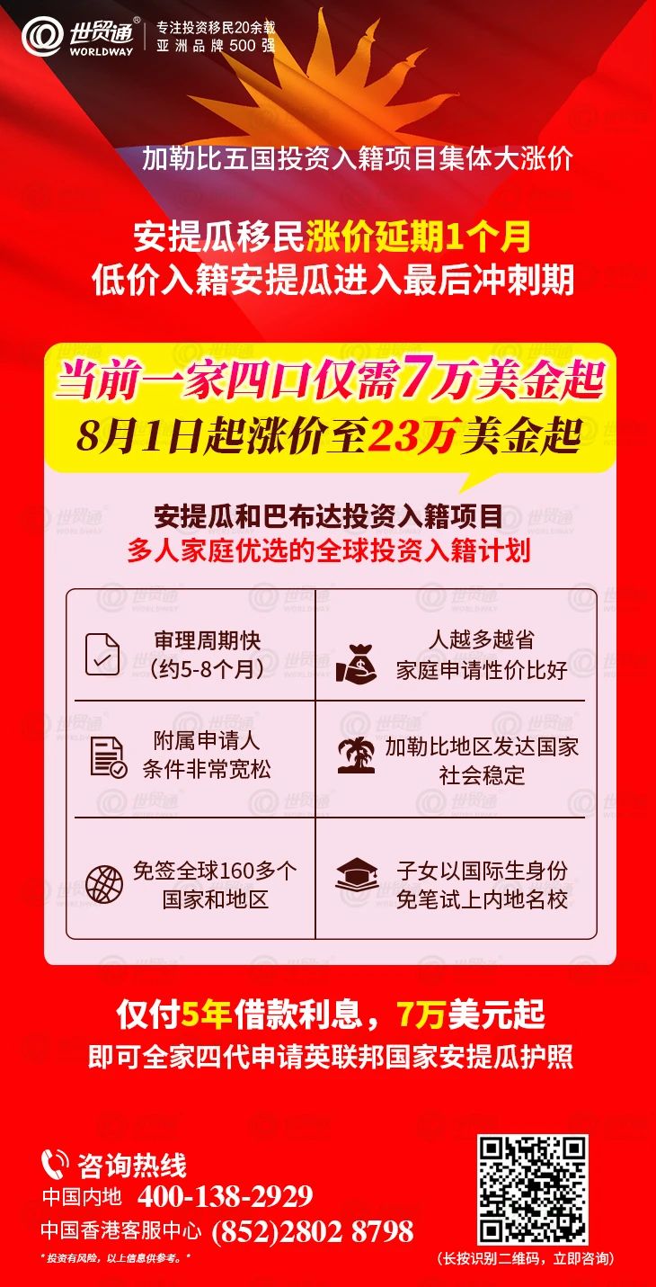 目前距离安提瓜7万美金低价投资窗口期,仅剩下最后几天!低价入籍安提瓜进入最后冲刺期,值得您把握,错过您将损失100多万!