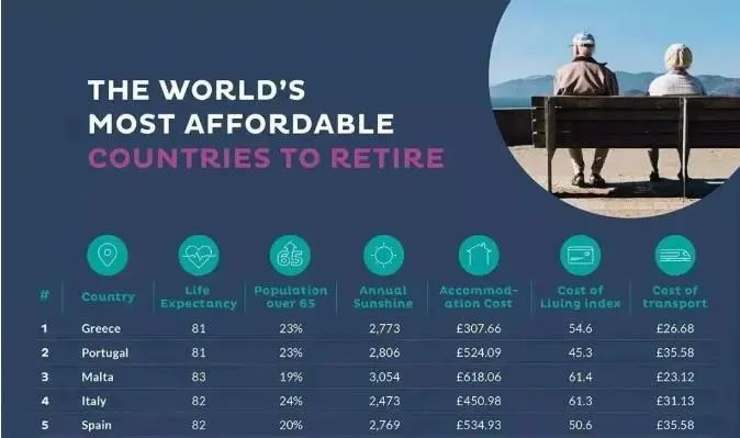 那么,如何选择一个舒适、宜居的养老目的地呢?近日,一份研究报告显示,通过对移居国外的养老人士的调查,列出了 6个关键因素作为评判标准。其中包括:全年日照水平;平均预期寿命;生活成本指数;平均住宿成本;平均交通成本;65岁以上人口所占比例。