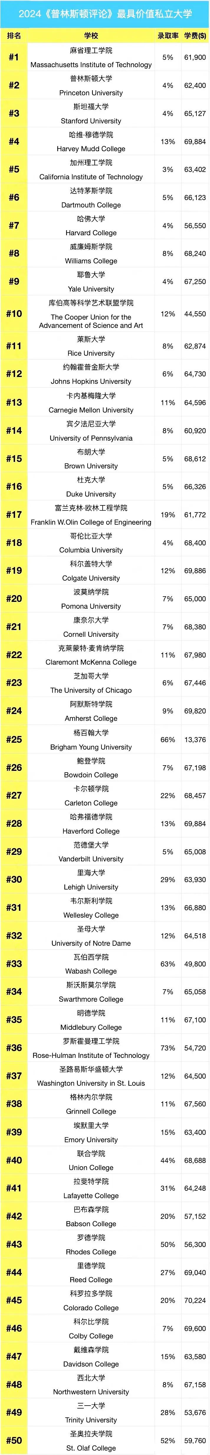 50所私立大学中共有23所综合性大学、23所文理学院、2所理工院校、1所商学院和1所专业院校上榜,麻省理工学院位列榜首。平均录取率为17%,超七成的学校录取率在20%以下。