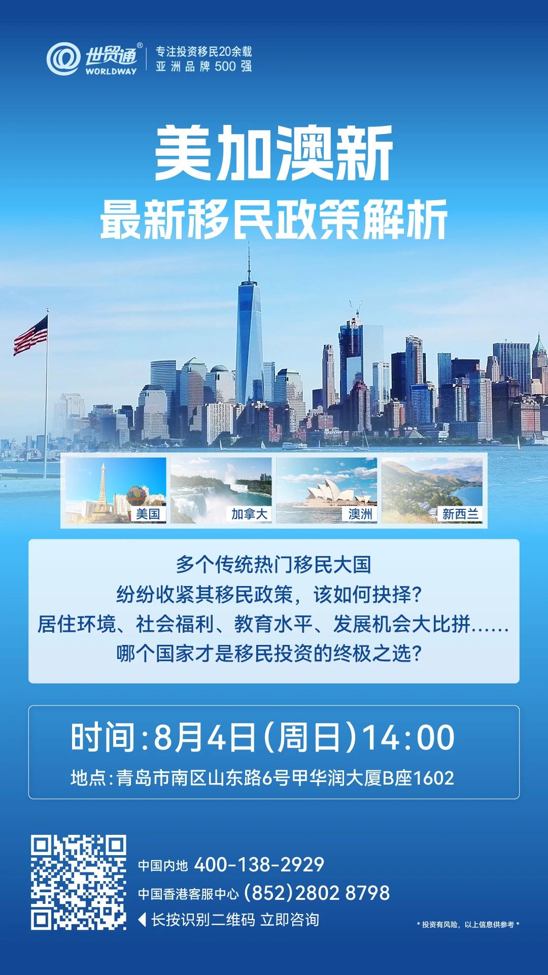 美加澳新最新移民政策解析2024年8月4日• 世贸通• 978 阅读 详询咨询 中国内地: 400-138-2929中国香港客服中心: (852)2802-8798 投资有风险,以上信息供参考 上一篇欧洲移民热门国家政策全解析下一篇为什么那么多人“扎堆”移民到这个欧洲国家?