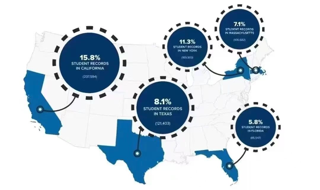 从美国各州数据来看,加利福尼亚州(237,594名)、纽约州(169,903名)、⻢萨诸塞州(106,682名)、得克萨斯州(121,403名)和佛罗⾥达州(86,547名)五个州接收了最多的国际学生,共计722,129人,占到了全美留学生总人数的48% 。