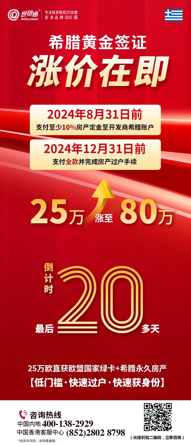 希腊购房移民项目将于9月1日起涨价至80万欧元,变政之下,就是和时间赛跑!如果想要抓住最后的机会,以旧的政策办理希腊移民(即25万欧元低价移民希腊),则需要在2024年8月31日前支付至少10%房产定金至开发商希腊账户,在2024年12月31日前,支付全款并完成房产过户手续。现在就是行动的最佳时机,赶紧锁定政策,抓紧上车,才是当下最适合的选择。