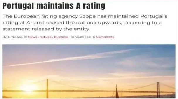好消息。近日,欧洲金融评级机构Scope宣布维持葡萄牙的信用评级为 A-,并上调展望。