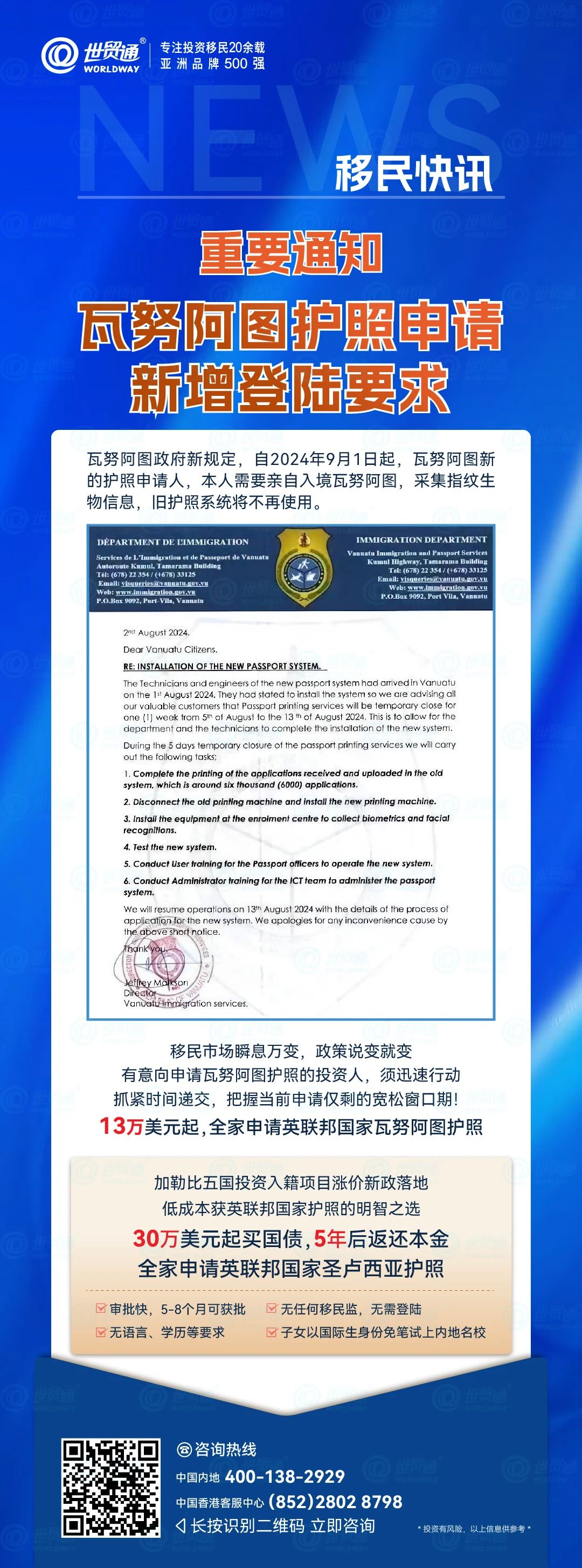 突发!瓦努阿图政府新规定,自2024年9月1日起,申请瓦努阿图护照的外国申请人,本人需要亲自登陆瓦努阿图,采集指纹生物信息,旧护照系统将不再使用。