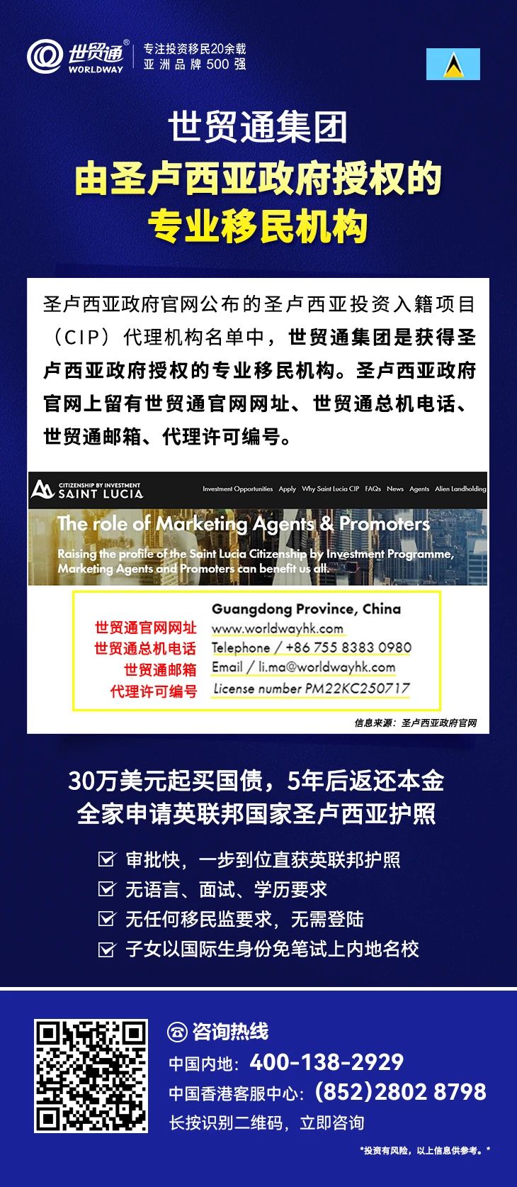 作为英联邦国家投资入籍项目的积极推动者,早在本世纪初就已开展英联邦国家快速入籍项目推广,是最早在中国推广英联邦投资入籍项目的移民公司之一。在英联邦护照项目推广方面,世贸通拥有丰富的经验和众多成功案例。世贸通集团是由圣卢西亚政府授权的专业移民机构,值得您选择。