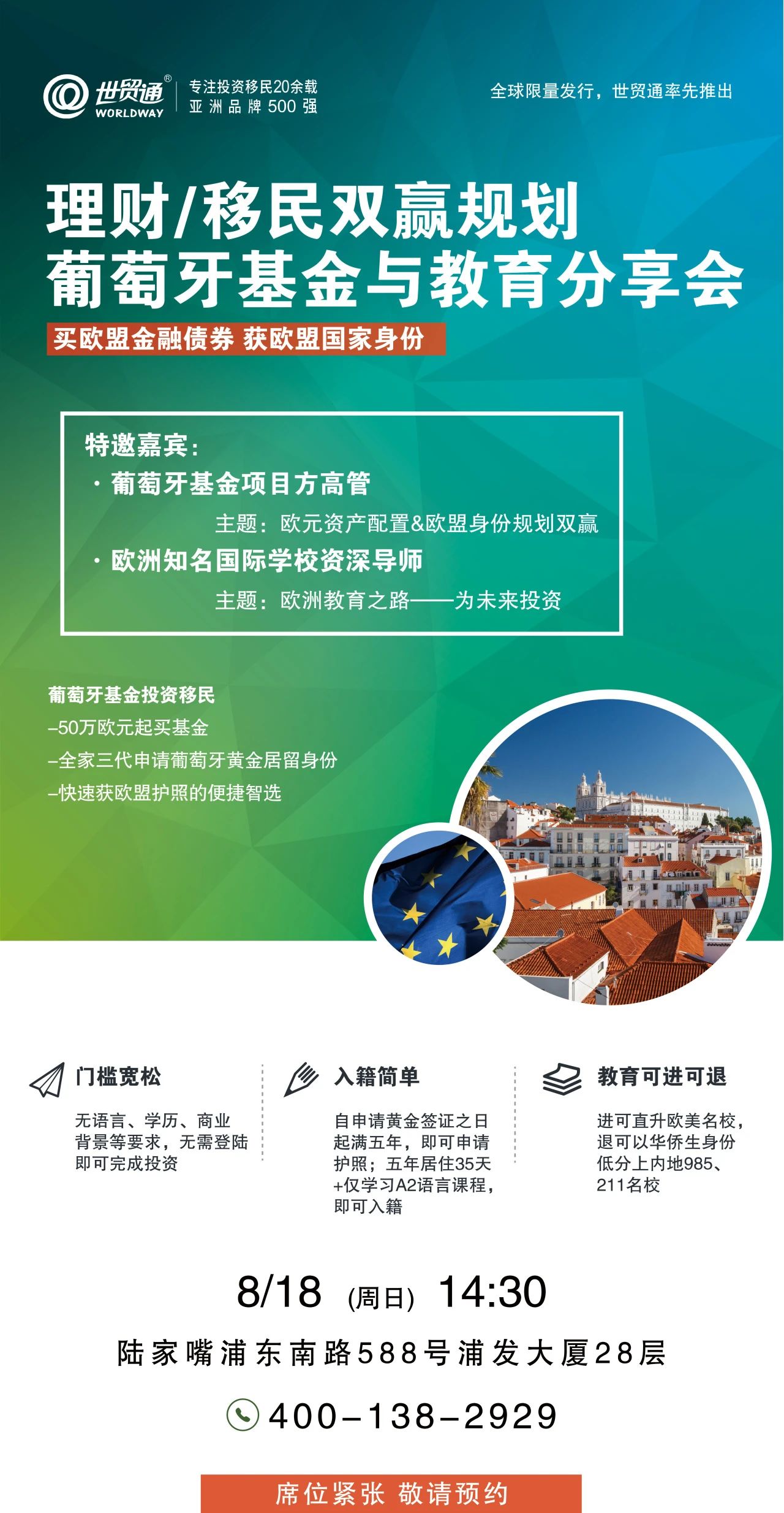 理财/移民双赢规划,葡萄牙基金与教育分享会2024年8月18日• 世贸通• 1.1k 阅读 详询咨询 中国内地: 400-138-2929中国香港客服中心: (852)2802-8798 投资有风险,以上信息供参考 上一篇不排队的美国EB-5投资移民攻略解析会下一篇移民为什么纷纷选择葡萄牙?5个关键原因揭晓