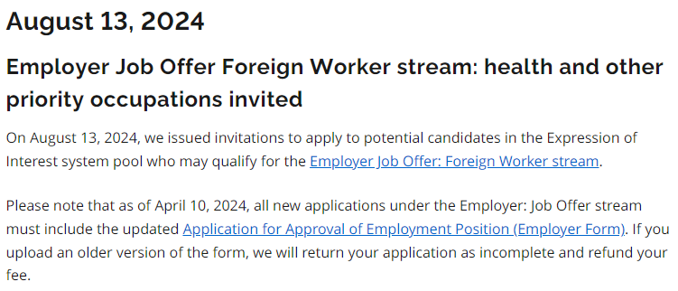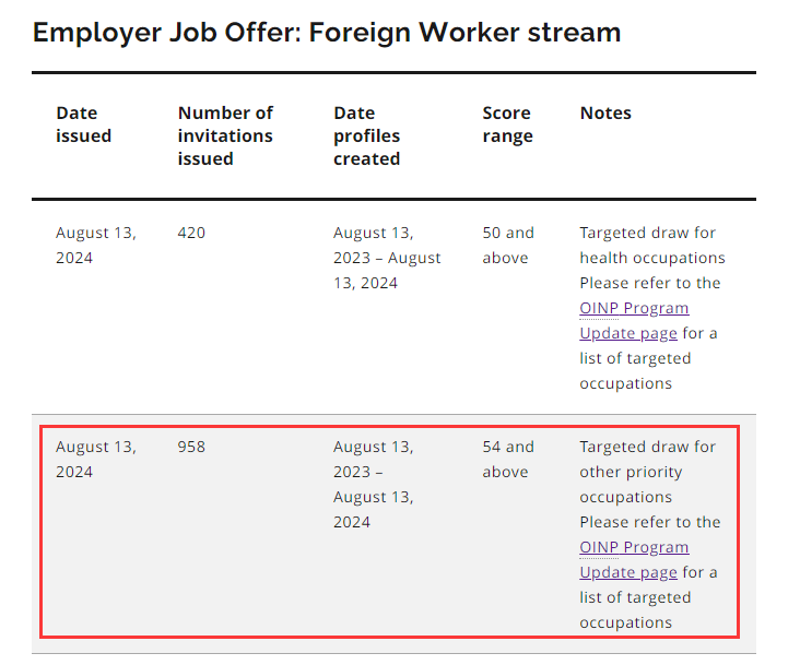 加拿大当地时间2024年8月13日,安省省提名(OINP)向雇主担保——海外劳工类别定向发放邀请,除了筛选定向的医护行业职位之外,此次还邀请了其他优先职位,如采购经理、财务经理等普通大类岗位,筛选最低分为54分,筛选人数958人。本轮定向优先职业类的获邀分数,高于前一轮1月19日常规抽选的50分。