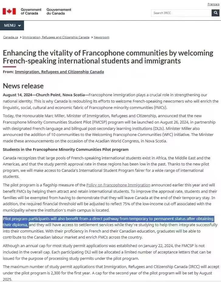 2024年8月14日,加拿大移民部宣布了一项全新的移民试点计划——法语少数民族社区留学生移民试点项目(FMCSP),旨在为选定国家(包括圣卢西亚、多米尼克等)的法语学生获得学习许可的一种方式。它为参与者在毕业后留在法语少数民族社区(魁北克以外)提供了一条途径。作为该试点项目的参与者,申请人在学习期间可以获得定居服务,毕业后有资格获得加拿大永久居留权。该项目将于2024年8月26日正式启动,2024年配额为2300个。