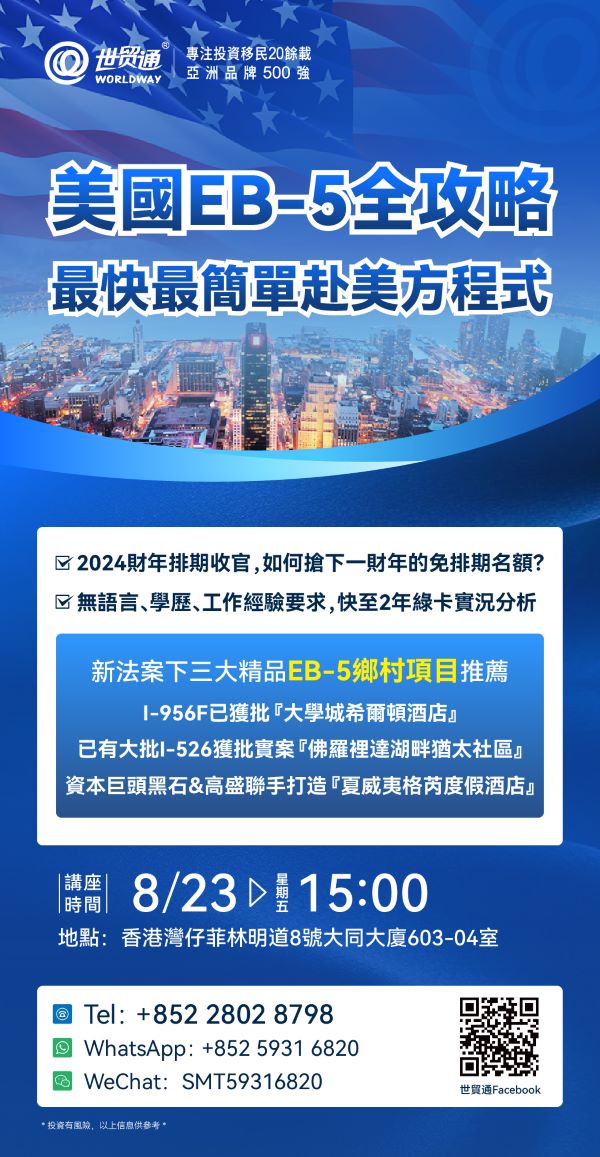 美国EB-5全攻略,最快最简单赴美方式2024年8月23日• 世贸通• 886 阅读 详询咨询 中国内地: 400-138-2929中国香港客服中心: (852)2802-8798 投资有风险,以上信息供参考 上一篇华侨生联考子女教育&身份规划私享会下一篇香港身份续期及永居申请沙龙会