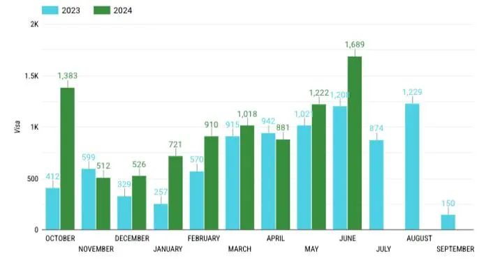 EB-5签证通过领事处理的月度发放情况:2024财年与2023财年对比