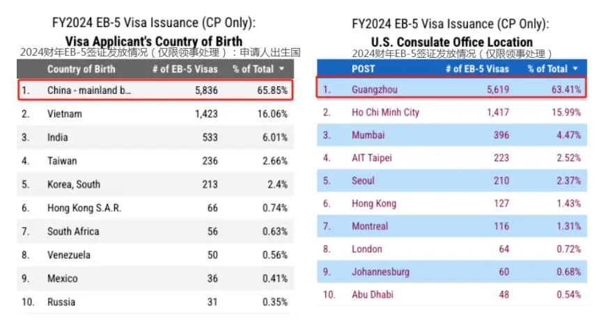 在2024财年,来自中国、越南、印度、台湾和韩国的申请者继续代表着最大的EB-5签证投资者群体,共同占据了本财年EB-5签证发放的93%。特别是,截至2024财年,超过65%的EB-5签证由中国申请者获得,其中广州总领事馆处理了超过5,600张EB-5签证。在处理EB-5签证积压方面发挥了关键作用。