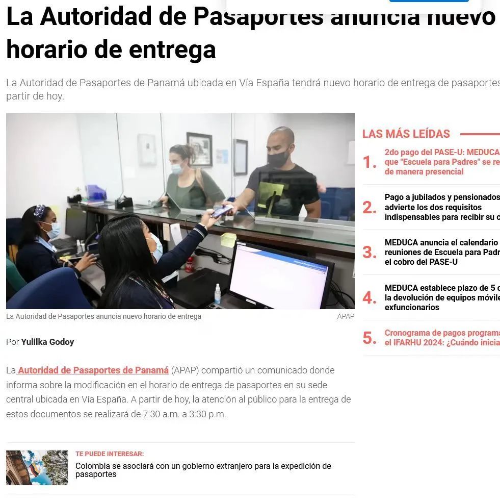 另外,温馨提示,巴拿马护照管理局(APAP)宣布,其位于Vía España总部的护照领取服务时间有所调整。新的服务时间为每日上午7:30至下午3:30,面向所有公众开放。此次时间调整旨在进一步优化服务流程,有效减少市民在领取护照时的等待时间。请留意这一新的服务时间变动,并据此合理规划自己的行程安排。