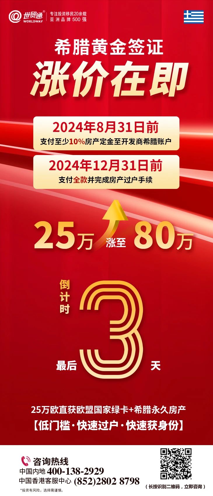 希腊移民涨价的钟声即将敲响,留给全球投资者低成本通往欧盟的时机已所剩无几。对于梦想在欧洲腹地安家置业的您来说,现在是作出决定的临界点。别让未来的自己惋惜今日的犹豫,错过这最后的机遇,意味着将来更高的成本支出。时间紧迫,立即行动刻不容缓。