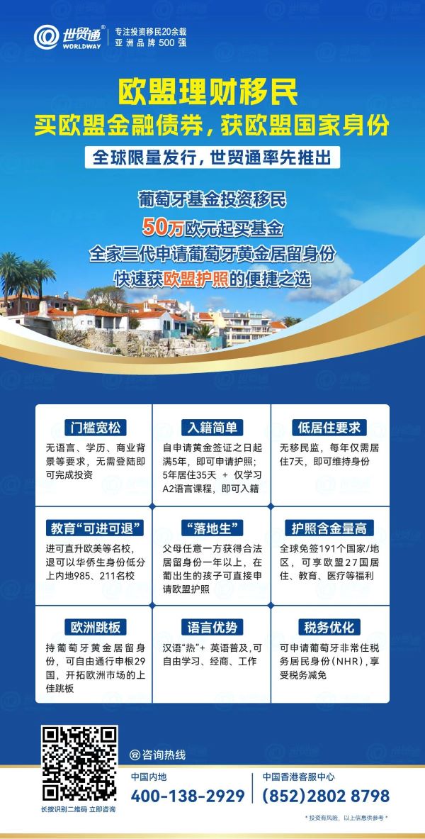 目前,正是移民葡萄牙的好时机。建议广大有意向移民的投资人把握机会,趁早申请!作为亚洲品牌500强和专注投资移民20余载的世贸通集团,是2012年10月份在中国较早推广葡萄牙黄金居留签证项目的移民机构,并在2013年4月,携手葡萄牙驻华大使馆举办了“葡萄牙黄金居留计划启动仪式”, 将葡萄牙黄金居留计划引入中国,助力众多投资者圆梦葡萄牙。世贸通集团,是您办理葡萄牙移民的放心之选。