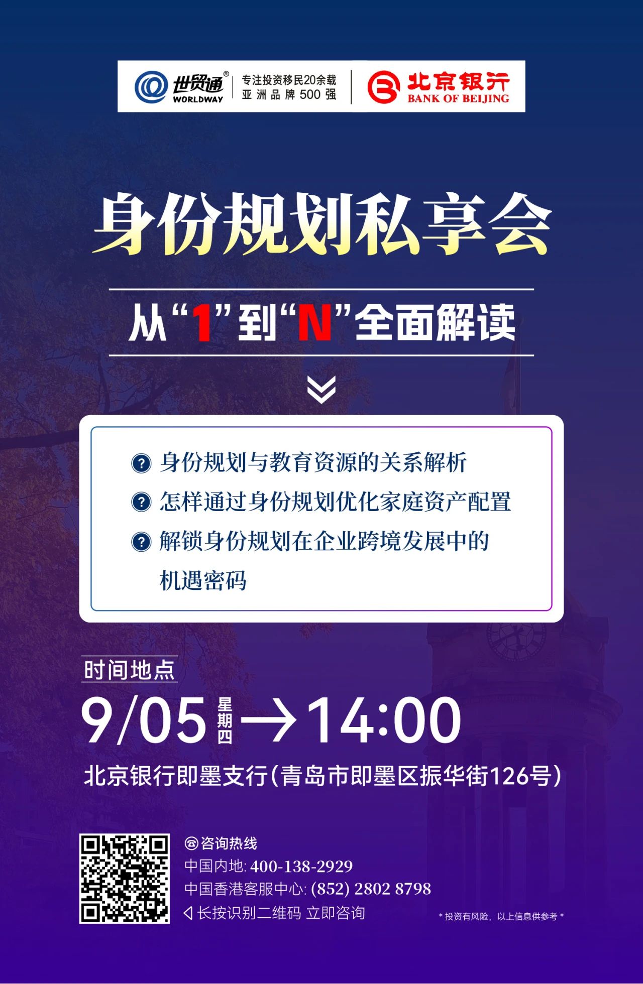 身份规划私享会2024年9月5日• 世贸通• 2.2k 阅读 详询咨询 中国内地: 400-138-2929中国香港客服中心: (852)2802-8798 投资有风险,以上信息供参考 上一篇名额即将告罄!抢手的EB-5乡村项目收官说明会下一篇香港投资移民申请,为什么有的人能轻松获批?