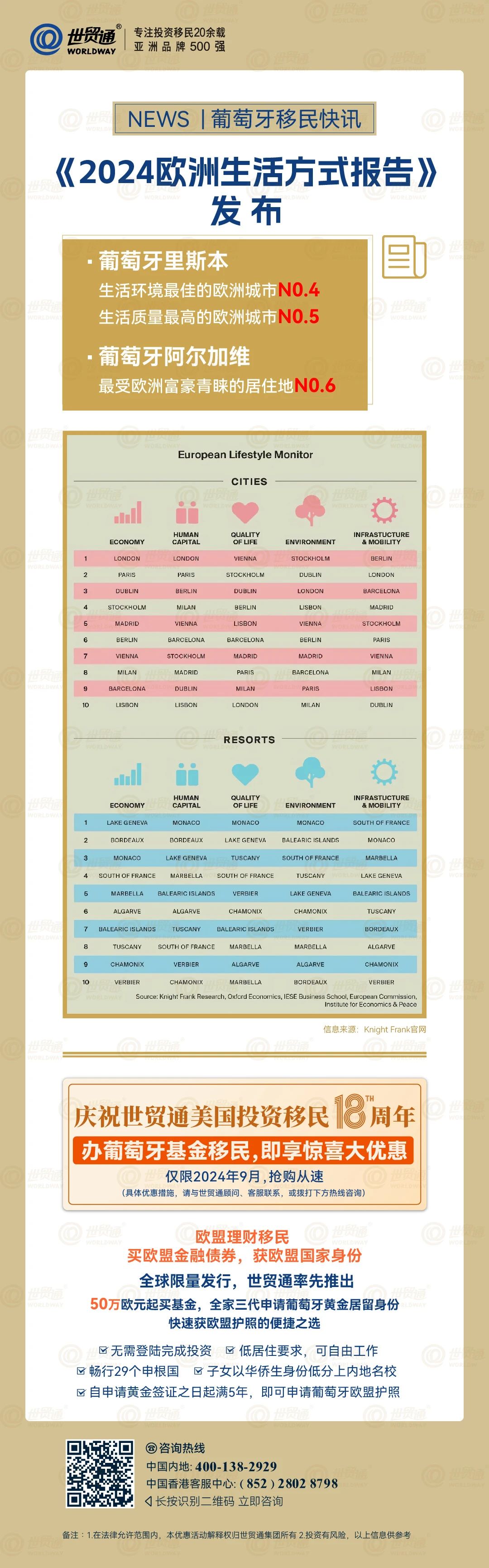 近日,根据莱坊发布的《2024欧洲生活方式报告》显示,葡萄牙里斯本荣获生活环境最佳的欧洲城市NO.4、生活质量最高的欧洲城市 NO.5;葡萄牙阿尔加维荣获最受欧洲富豪青睐的居住地NO.6。这也进一步说明,葡萄牙是一个适宜移民生活的国度。