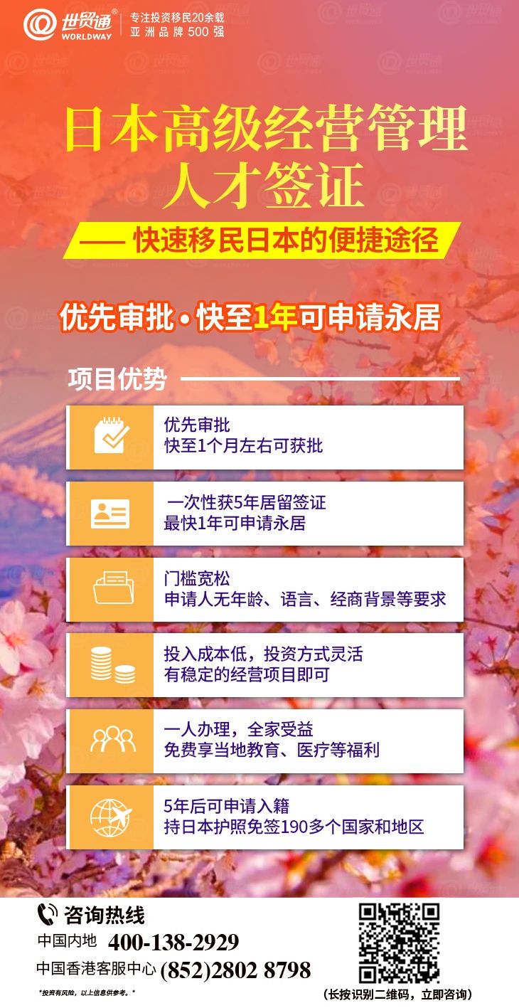 总体来讲,日本在诸多方面可谓称得上全球范围内的翘楚,完善的养老制度、过硬的医疗技术、优质的教育水平、高水平福利待遇、舒适宜居的环境等都令日本吸粉无数。目前,日本高级经营管理人才签证是快速移民日本的便捷途径,优先审批,快至1年可申请永居。通过学历、工作年限、年龄、年收入等情况进行打分,达到70分即可申请签证。有意向的投资者欢迎联系世贸通,为您进行专业评估。