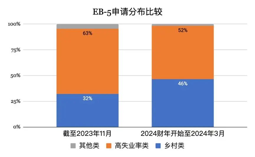 数据显示,城市项目的总体需求高于乡村项目,但乡村项目的申请量正在迅速增加。截至2023年11月的数据,高失业率地区达到63%,是这一时期内申请EB-5签证的主要类别;乡村地区项目的申请仅占32%。而从2024财年开始至2024年3月的数据,高失业率地区项目的申请为52%,来自乡村地区项目的申请则飙升至46%,显示出投资者对乡村地区项目的兴趣日益浓厚。