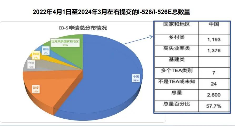 2022年4月1日-2024年3月左右期间,EB-5签证共收到了4508份申请。在申请国家方面,中国和印度继续成为EB-5项目的最大需求方。除此之外,来自中国台湾、韩国、越南及其他国家和地区的申请也保持强劲势头,展现了EB-5项目的全球吸引力。