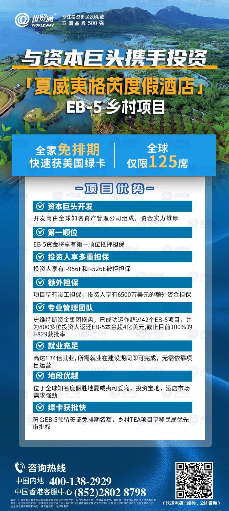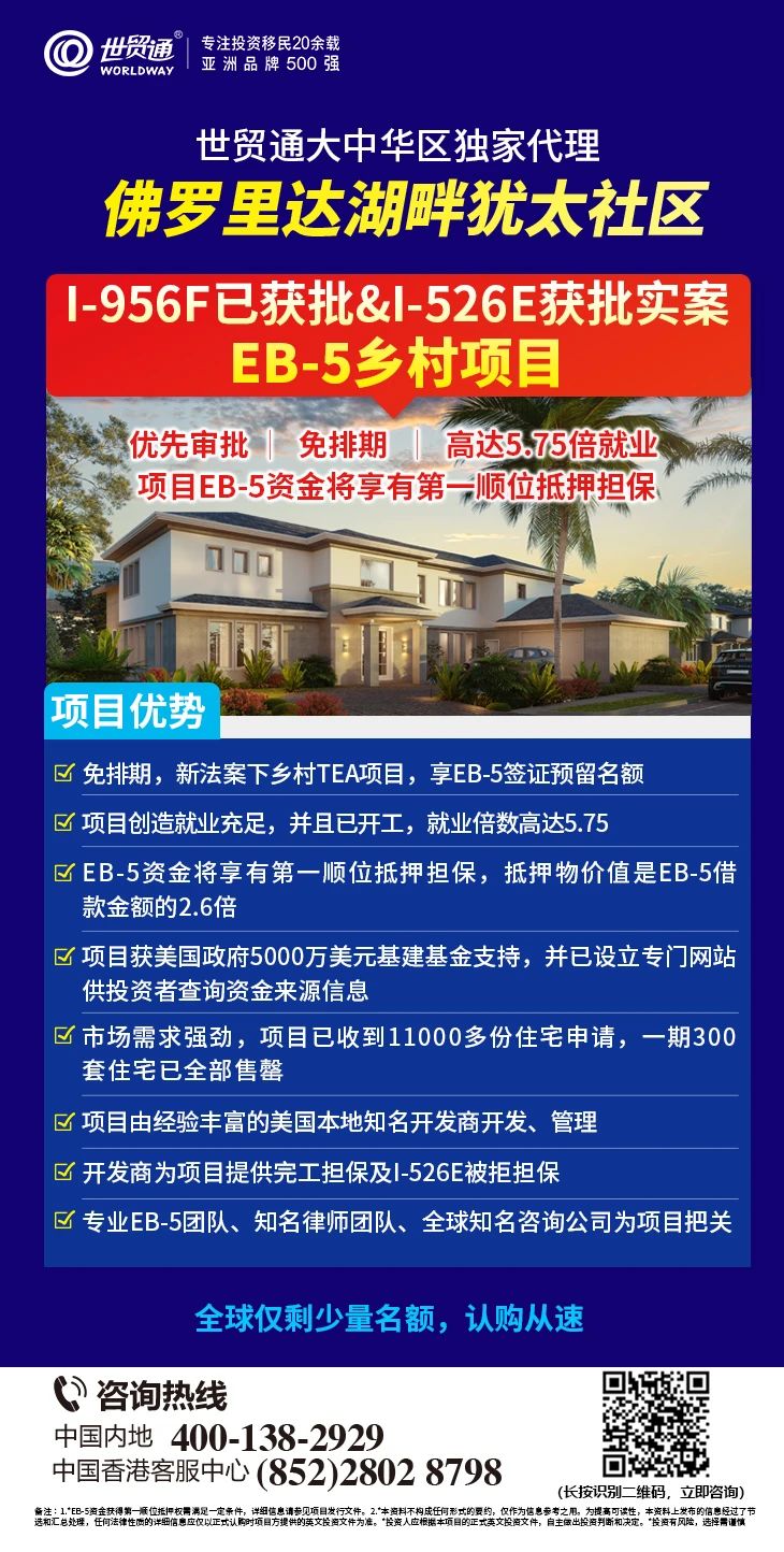 这三大精品EB-5项目,均是符合新法案下乡村TEA项目,不仅享EB-5签证预留名额,且获得移民局的优先审理,集免排期、优先审批、EB-5资金将享有第一顺位抵押担保等诸多优势,投资80万美金起,一人申请,全家快速获绿卡,名额稀缺,抢购从速。