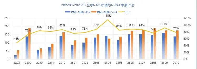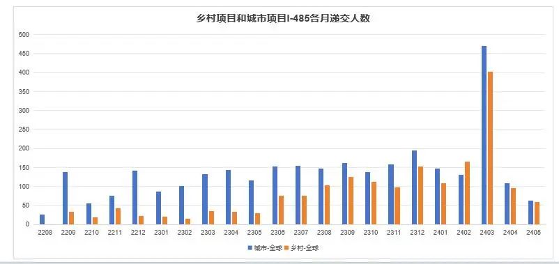 新法案后,双递交比例占比非常高,越来越多申请人看到了EB-5新政“双递交”的巨大好处。根据移民局公布的I-485数据,从2022年8月-2023年10月,城市平均双递交占比约82%。乡村平均双递交占比约68%。从总量来看,选择双递交的投资者更倾向于城市项目,但从增长趋势来看,乡村项目的占比越来越高。