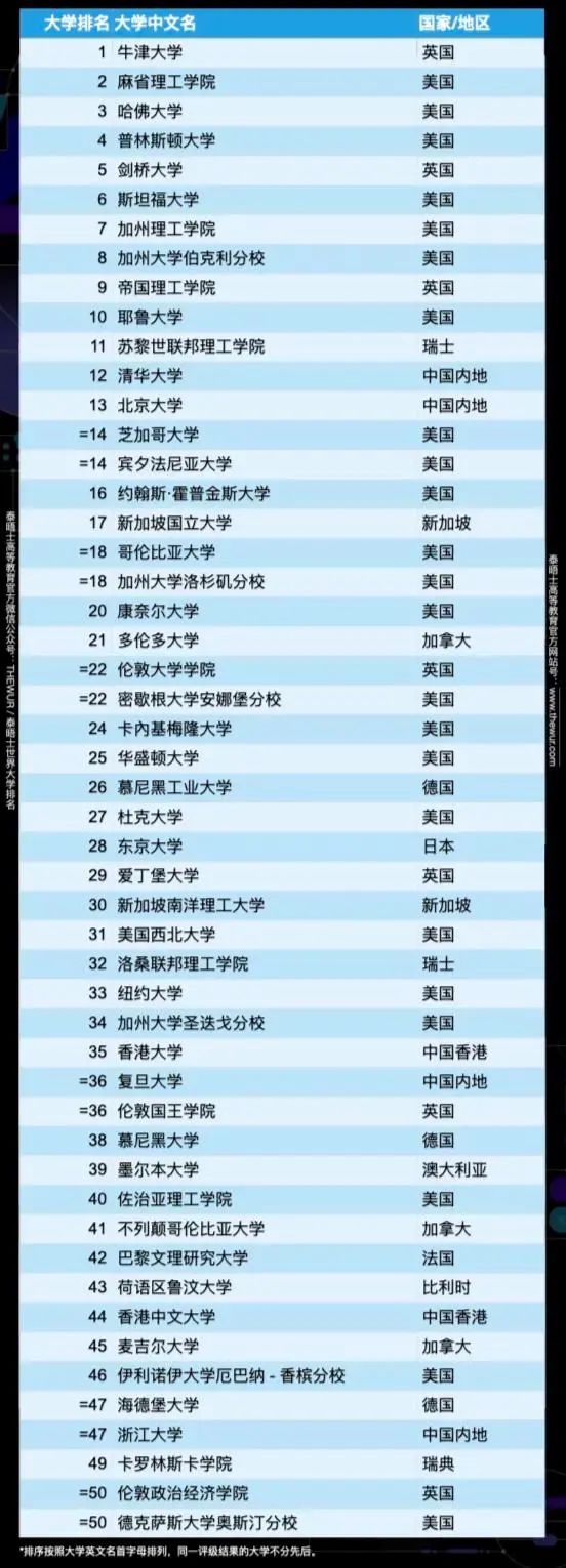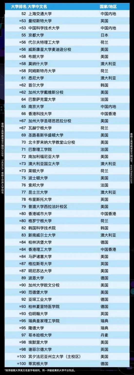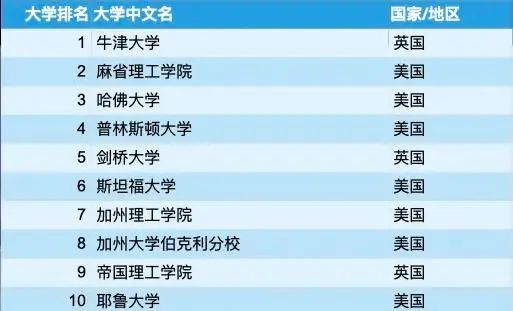 其中,麻省理工学院世界排名第2,哈佛大学位列第3,普林斯顿大学位列第4,斯坦福大学位列第6,加州理工学院位列第7,加州伯克利分校位列第8,耶鲁大学位列第10。