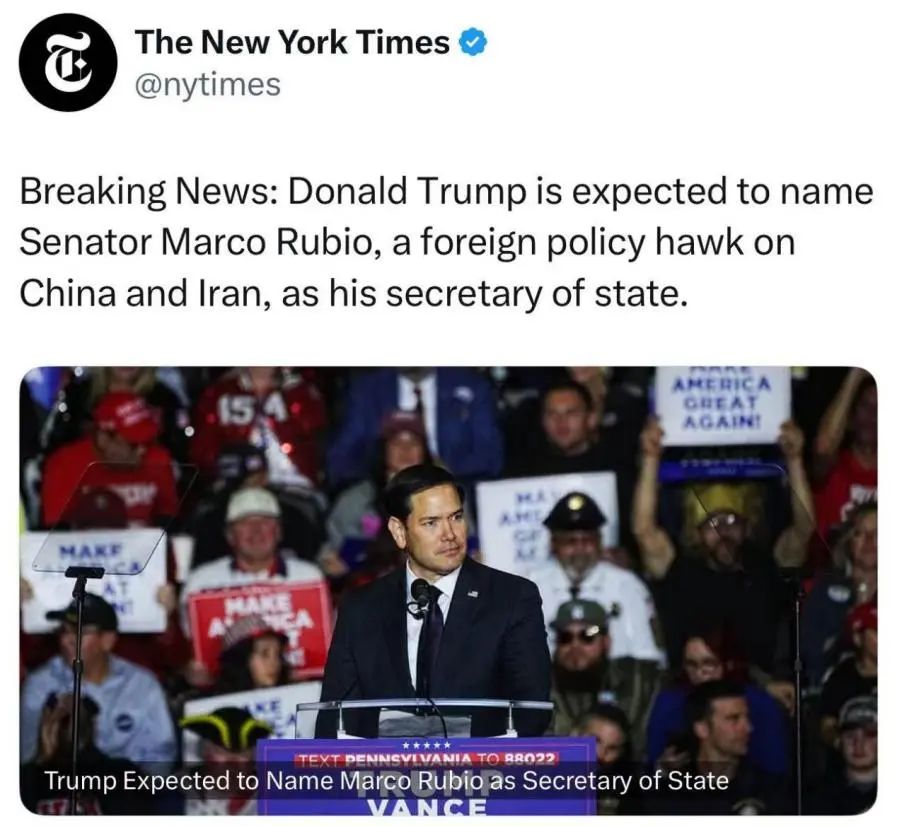 特朗普预计将任命美国参议员Senator Marco Rubio,马尔科·卢比奥担任国务卿。这意味着,在这位共和党当选总统于明年1月就职后,这位出生于佛罗里达州的政治家将成为首位出任美国最高外交官的拉丁裔。