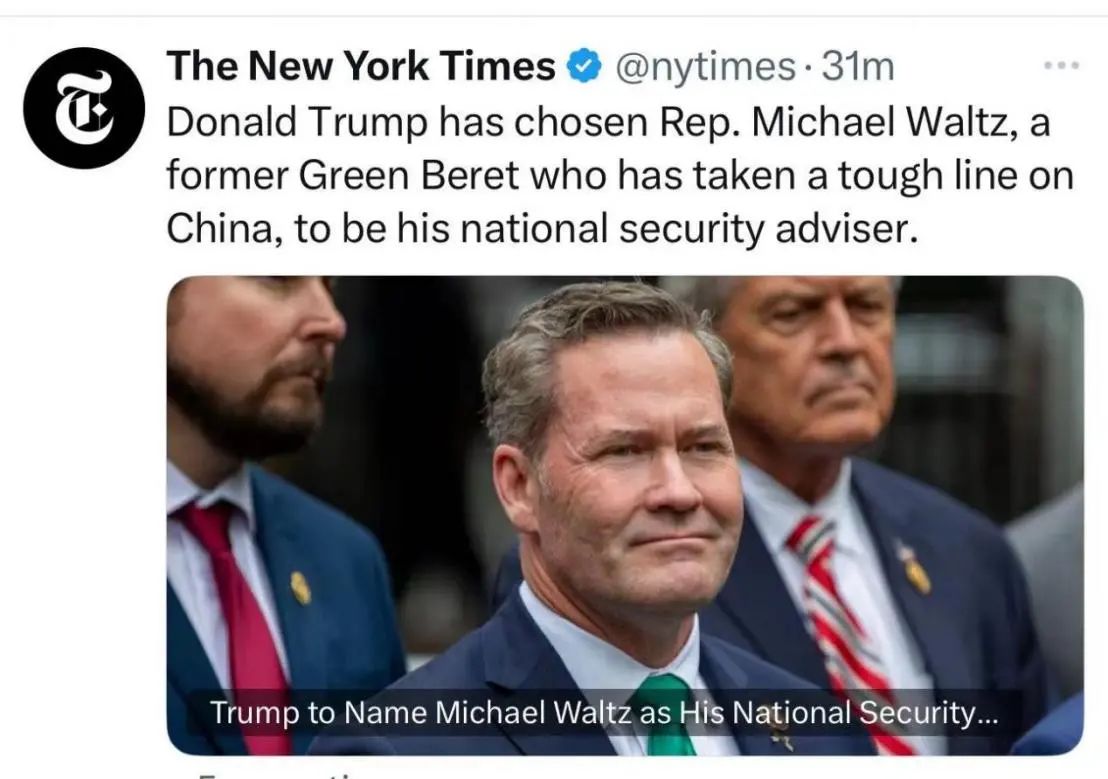 特朗普已邀请佛罗里达州众议员迈克·沃尔兹Rep.Michael Waltz担任其国家安全顾问。担任这一职务后,沃尔兹必须应对特朗普政府第二任期内将面临的一系列地缘政治冲突,包括乌克兰与俄罗斯的战争以及以色列与哈马斯的战争。