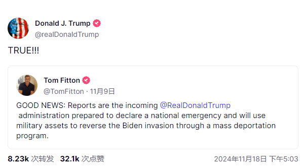 在特朗普自己创建的“真实社交”这一社媒平台上,特朗普回复了一名保守派组织领导人的推文,原推文上写道:“特朗普政府准备宣布进入紧急状态,并使用军方设施,通过大规模驱逐计划逆转拜登政府时期的(非法移民)入侵。”