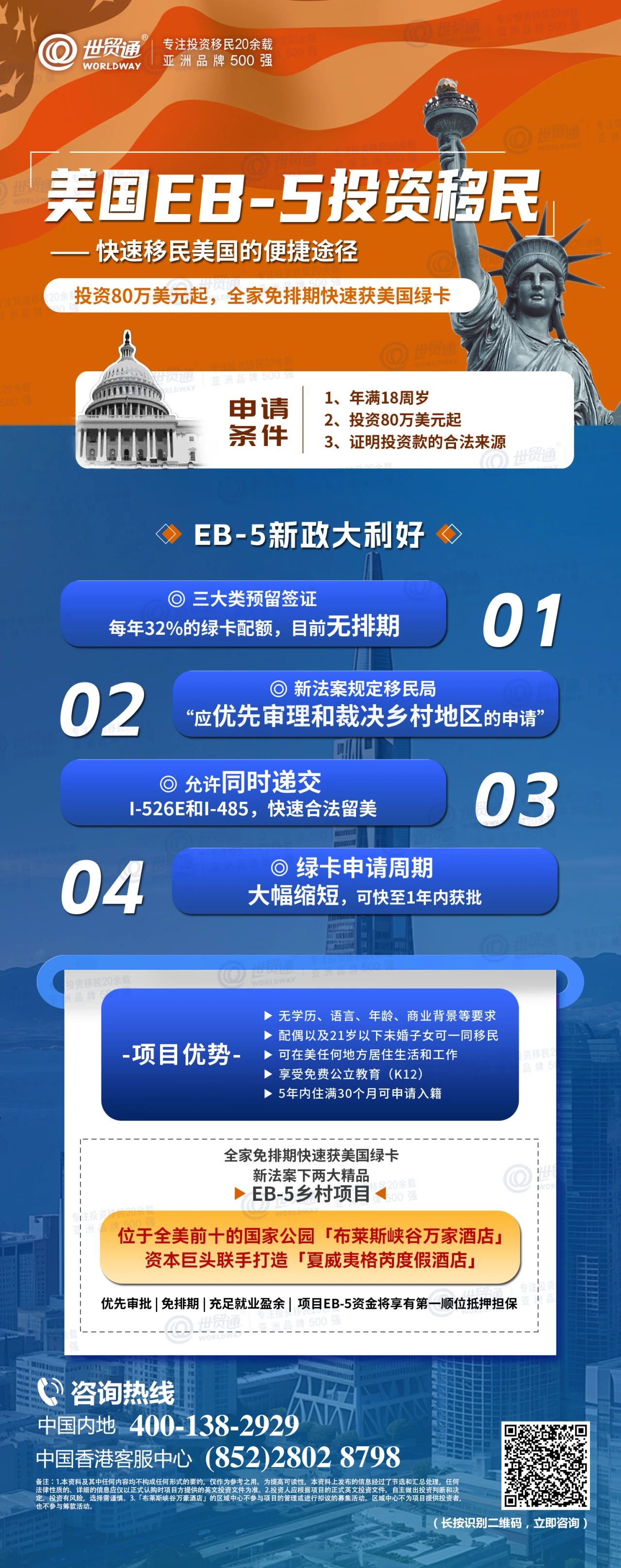 对于移美家庭而言,早日进行身份规划,选对赛道才是至关重要的。目前,正是通过EB-5方式移民美国的好时机。新政下的EB-5投资移民,在中国大陆出生的申请人暂时未出现需要排期的情况,尽早递交申请,锁定优先日,早日实现移民美国的梦想。