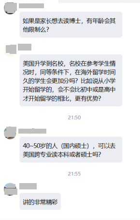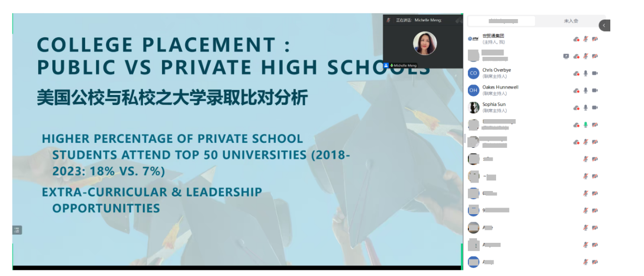 本次活动特邀美国波士顿著名私校校董、美国艾森豪威尔总统基金会董事Sophia sun女士,美国知名国际教育集团高级合伙人、曾任美国著名私校招生办主任20年、美国SSAT考试协会成员Christopher G.Overbye先生,以及毕业于哈佛大学、美国认证教育规划师CEP、美国国家大学顾问委员会成员Oakes Hunnewell Jr. 先生重装出席。活动反响热烈,直播间人气爆棚,数百名新移民家长和学生齐聚线上,共同聆听多位教育专家的精彩分享。