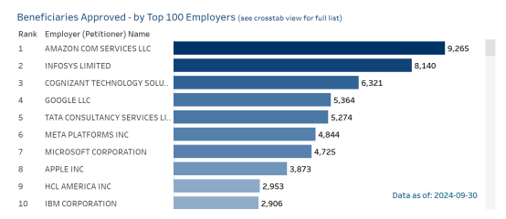 根据美国移民局的数据,提供H-1B签证数量排名前十的雇主分别是:
