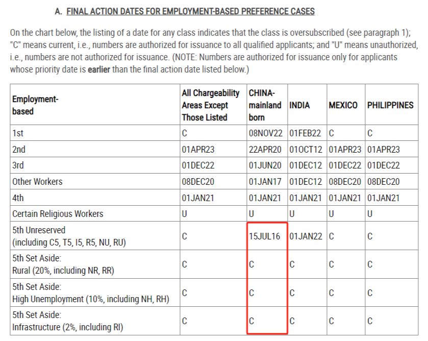 ·A表:Final Action Dates For Employment-Based Preference Cases(注:美领馆面签&移民局递交AOS身份转换申请)