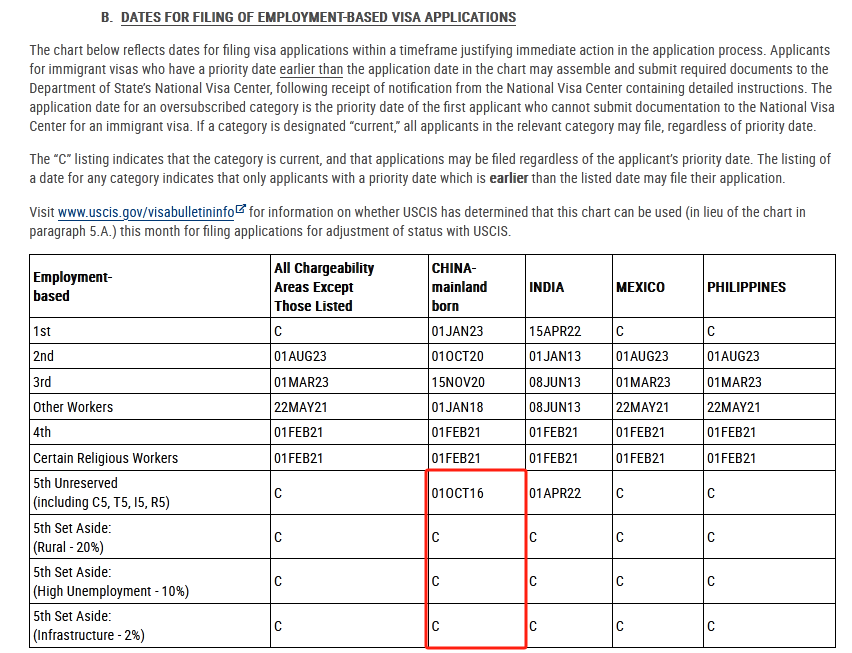 ·B表:Dates For Filing Of Employment-Based Visa Applications(注:在美国合法居住且满足相关条件,向移民局递交AOS身份转换申请)