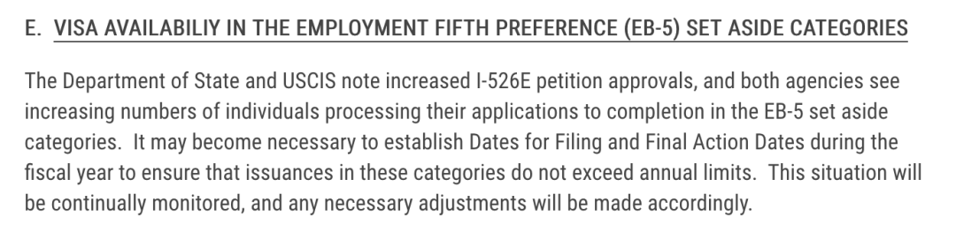 DOS与移民局联合提示,I-526E获批量增加,同时EB-5预留类别的签证/绿卡申请量增加。在本财年,可能有必要因此设立表A和表B,以保障这些类别的签证发放不超过配额。DOS和移民局将持续监控这一情况,并适时进行必要的调整。
