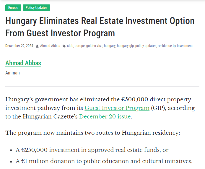 根据《匈牙利公报》12月20日的报道,匈牙利政府已取消了其“访客投资者计划”(GIP)中的50万欧元直接房地产投资途径。