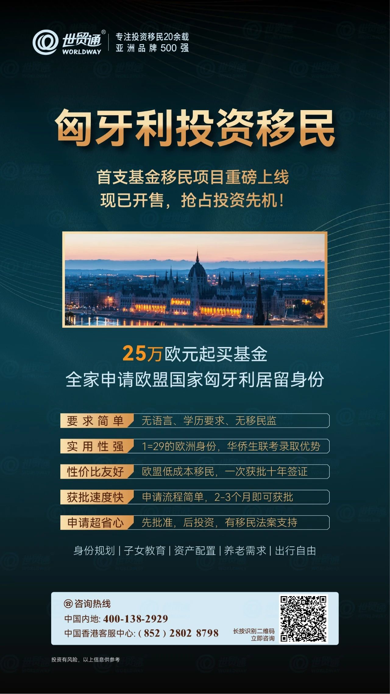 首支基金移民项目现已重磅上线,截止目前,已有客户顺利完成基金认购,拿到身份。匈牙利移民基金项目现已接受认购,请申请人把握投资先机!匈牙利身份规划,不仅是一个安居乐业的选择,更是开启欧洲生活的大门。无论您是考虑投资、创业还是居住,匈牙利以其亲民的性价比,都是一个不错的理想之选!