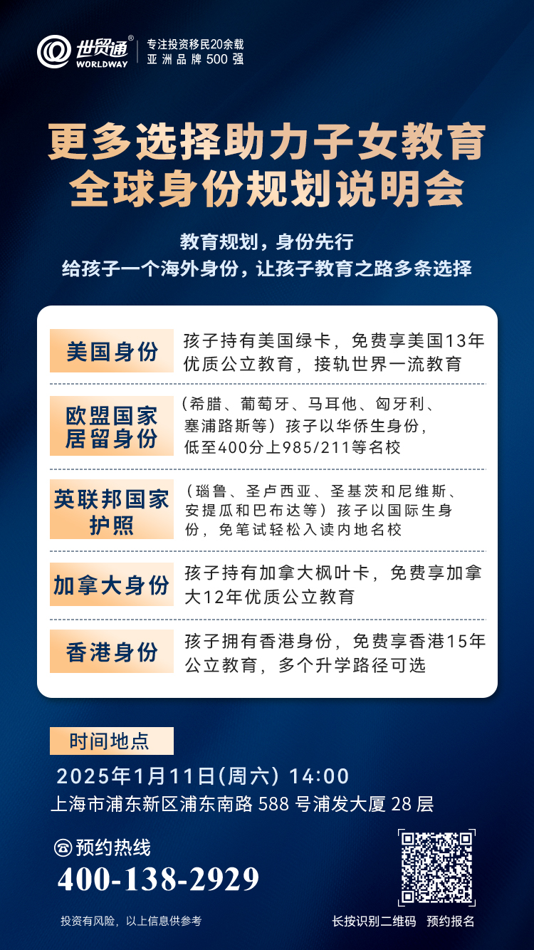 更多选择助力子女教育 全球身份规划说明会2025年1月11日• 世贸通• 1.2k 阅读 详询咨询 中国内地: 400-138-2929中国香港客服中心: (852)2802-8798 投资有风险,以上信息供参考 上一篇美加澳最新移民指南下一篇为什么大量中国人抢着移民这个欧洲国家?