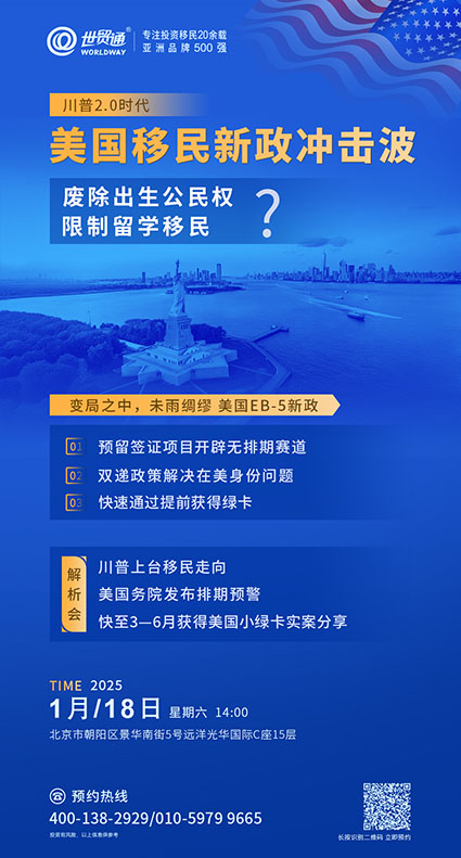 美国移民新政冲击波2025年1月18日• 世贸通• 1.6k 阅读 详询咨询 中国内地: 400-138-2929中国香港客服中心: (852)2802-8798 投资有风险,以上信息供参考 上一篇专业办理美国投资移民19年!世贸通再次荣摘行业大奖下一篇移民韩国什么条件?全面解析移民韩国的必备条件与流程