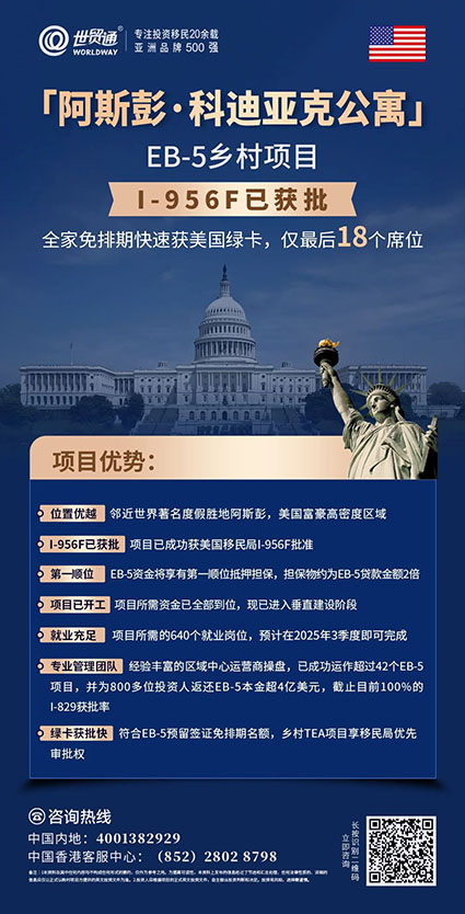 「阿斯彭▪科迪亚克公寓」项目地理位置优越,坐落于世界著名度假胜地阿斯彭的邻近地区,是美国富豪密度最高的地区之一。项目所需资金已全部到位,现已进入垂直建设阶段,计划于2025年第三季度完工。项目均是符合新法案下乡村TEA项目,不仅享EB-5签证预留名额,且获得移民局的优先审批权,集免排期、优先审批、EB-5资金将享有第一顺位抵押担保等诸多优势。投资80万美金起,全家可免排期快速获美国绿卡,全球仅余最后十几个名额,抢购从速!