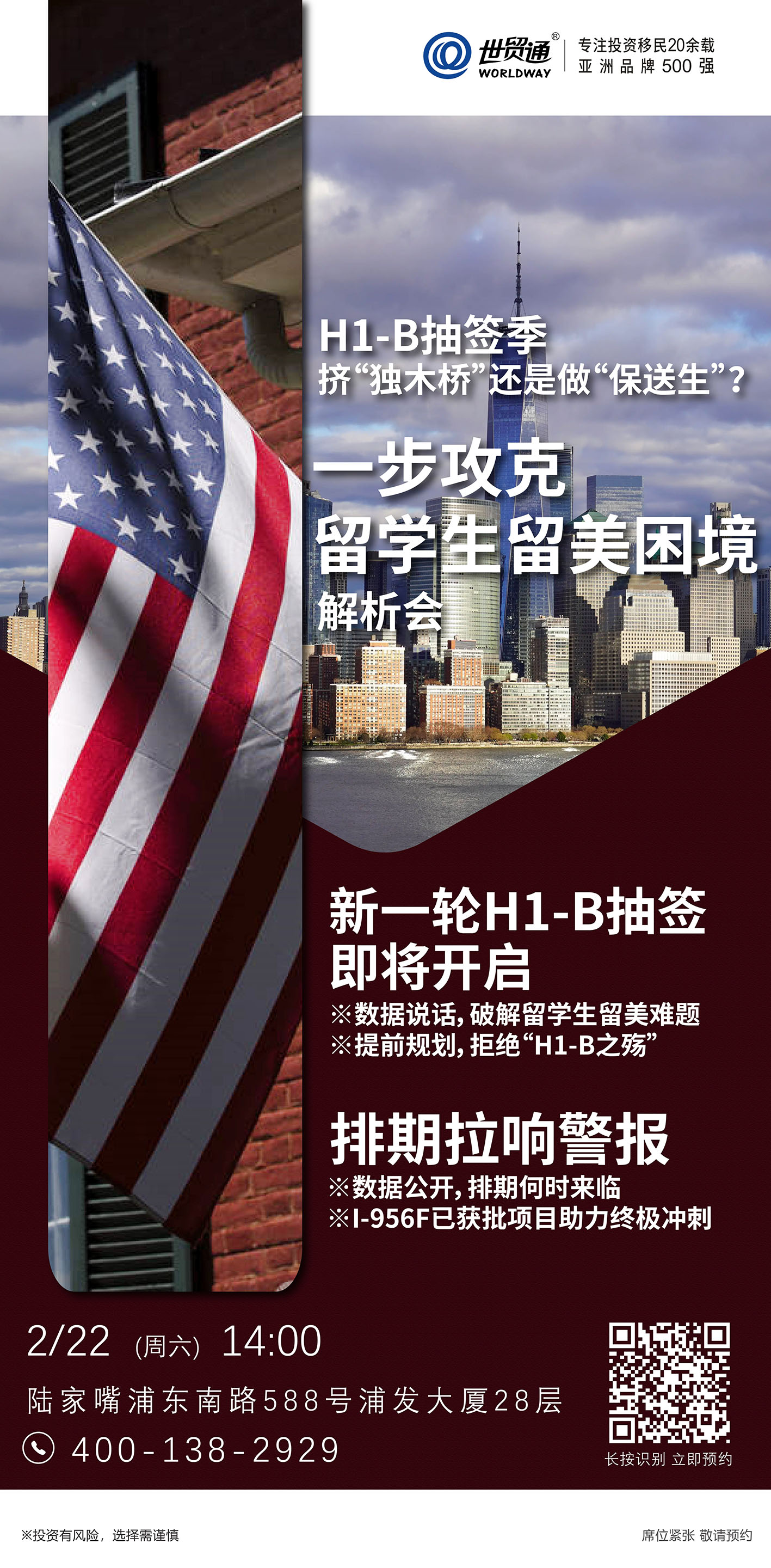 一步攻克留学生留美困境解析会2025年2月22日• 世贸通• 461 阅读 详询咨询 中国内地: 400-138-2929中国香港客服中心: (852)2802-8798 投资有风险,以上信息供参考 上一篇喜报!大学城希尔顿酒店EB-5乡村项目开业了下一篇喜讯!夏威夷格芮度假酒店EB-5乡村项目I-956F获批