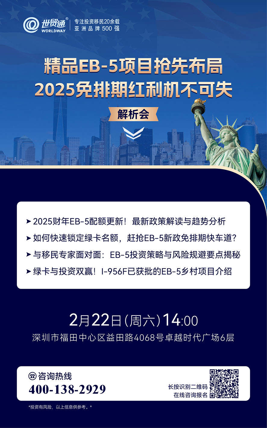 精品EB-5项目抢先布局 2025免排期红利机不可失解析会2025年2月22日• 世贸通• 552 阅读 详询咨询 中国内地: 400-138-2929中国香港客服中心: (852)2802-8798 投资有风险,以上信息供参考 上一篇喜报!大学城希尔顿酒店EB-5乡村项目开业了下一篇EB-5乡村项目“典范”:I-829所需就业全部实现!