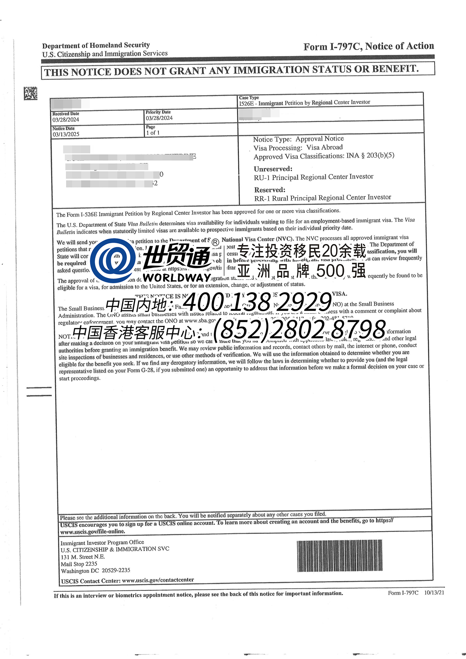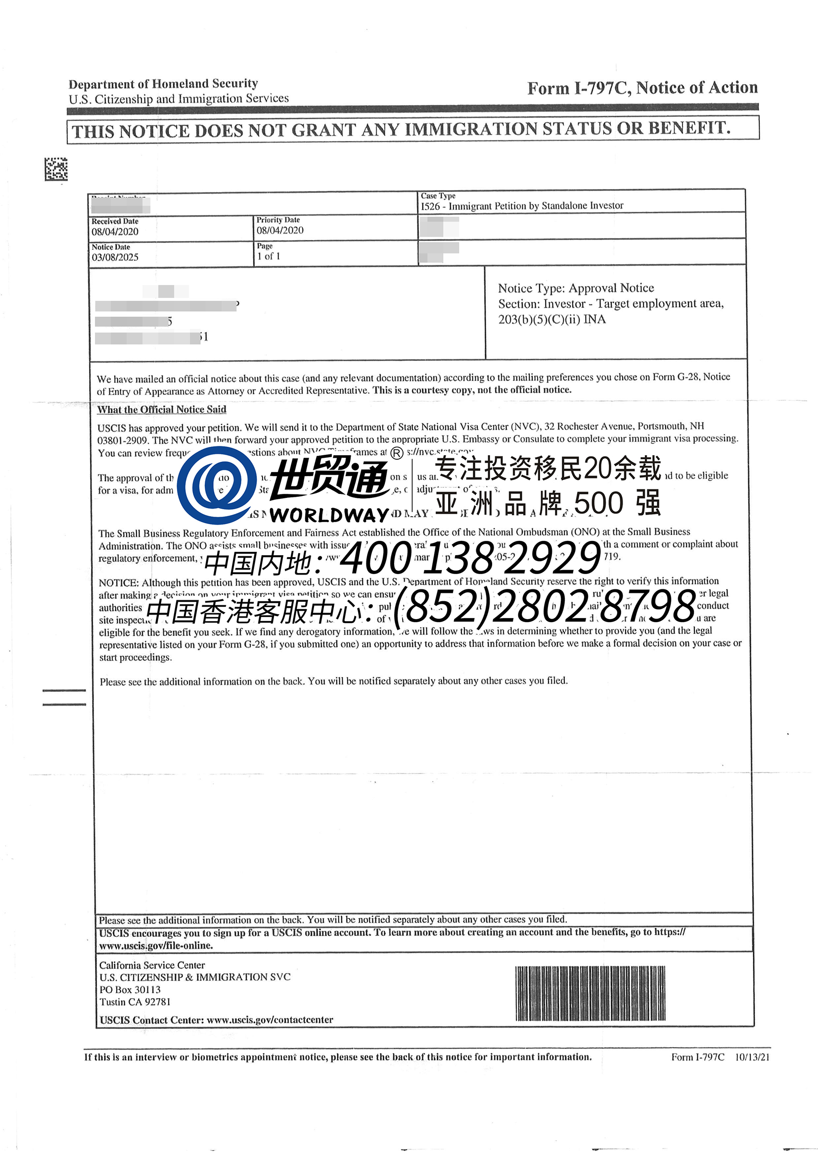 世贸通大批美国EB-5移民客户I-526获批