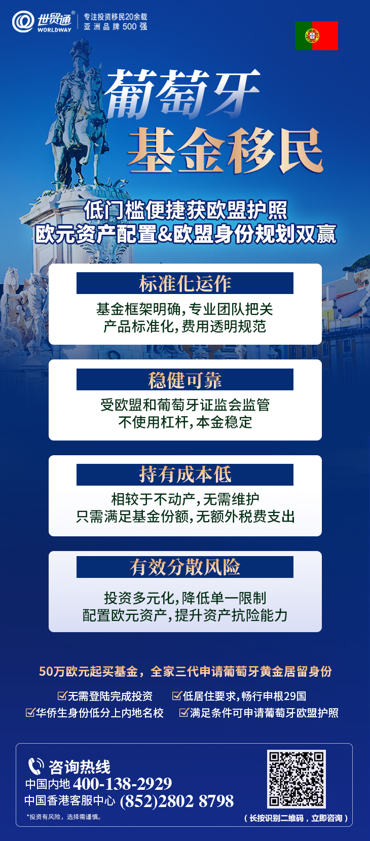 作为亚洲品牌500强、专注投资移民20余载的世贸通集团,在身份规划的道路上,始终与您并肩同行。如您有移民意向,世贸通20多国(地区)移民项目,为您提供丰富多样的选择空间。如:美国投资移民;加拿大移民;巴拿马移民;希腊、葡萄牙、塞浦路斯、马耳他、匈牙利、土耳其、西班牙、爱尔兰等欧洲国家移民及欧盟护照项目;瑙鲁、圣卢西亚、圣基茨和尼维斯、安提瓜和巴布达、多米尼克、格林纳达、瓦努阿图等英联邦国家投资入籍项目;香港移民;澳门移民;日本移民;韩国移民;澳大利亚移民;海外房产咨询及协助海外安家等服务。
