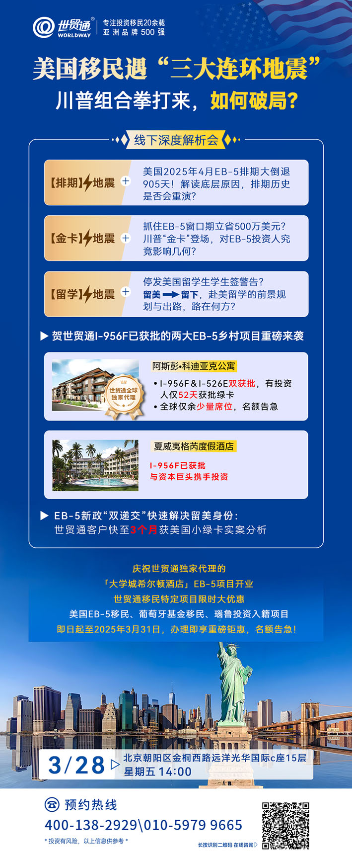 美国移民遇“三大连环地震” 川普组合拳打来,如何破局?2025年3月28日• 世贸通• 480 阅读 详询咨询 中国内地: 400-138-2929中国香港客服中心: (852)2802-8798 投资有风险,以上信息供参考 上一篇突发:美国暂停处理部分绿卡申请下一篇把握时机 美国投资移民排期